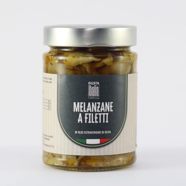 Gusto forte e deciso, di terra pietrosa e sapidità del mare racchiuso in strisce di melanzane immerse in olio extravergine di oliva, accompagnate dal sapore del sole e importante nota di freschezza da aceto di vino.